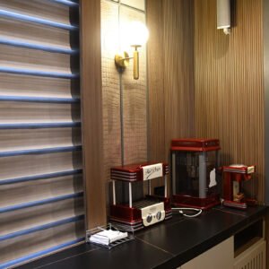 Hemos recreado un cine totalmente real, ofreciendo una experiencia inmersiva y auténtica. La iluminación indirecta crea un ambiente acogedor y sofisticado, perfecto para disfrutar. Las paredes están cubiertas con enchape de madera, aportando calidez y elegancia al espacio. Además, hemos utilizado losetas de cuero y elementos decorativos cuidadosamente seleccionados para complementar la estética del lugar, dándole un toque lujoso y moderno.